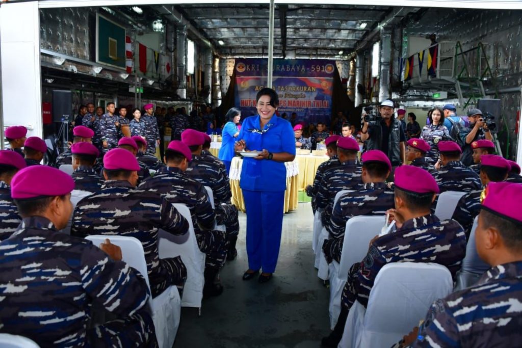 Jakarta, MCN.com – 16 November 2022, Disela-sela peninjauan unsur-unsur TNI Angkatan Laut (TNI AL) yang tergabung dalam Satuan Tugas Laut (Satgasla) Pengamanan (PAM) Presidensi G20, Kepala Staf Angkatan Laut (Kasal) Laksamana TNI Yudo Margono didampingi Ny. Vero Yudo Margono melaksanakan Tasyakuran dalam rangka memperingati Hari Ulang Tahun (HUT) ke-77 yang jatuh tepat tanggal 15 November 2022 di atas Geladak KRI Surabaya-591 saat bersandar di Dermaga Benoa, Bali. Selasa, (15/11) kemarin.