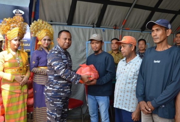 Pada kesempatan itu pula, Danlanal Dumai didampingi Unsur Maritim yang berada di Kabupaten Inhil melaksanakan Bakti Sosial peduli masyarakat pesisir dengan membagikan paket sembako untuk nelayan dan masyarakat disekitar Perairan Tembilahan.