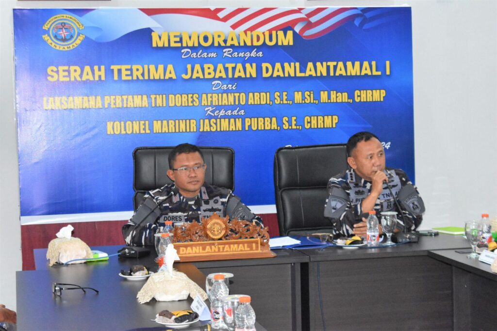 Komandan Pangkalan Utama TNI Angkatan Laut I (Danlantamal I) Laksamana Pertama TNI Dores Afrianto Ardi, S.E., M.Si., M.Han., CHRMP., membacakan Memorandum dalam rangka Sertijab Danlantamal I yang nantinya akan dijabat oleh, Kolonel Marinir Jasiman Purba, S.E., CHRMP.