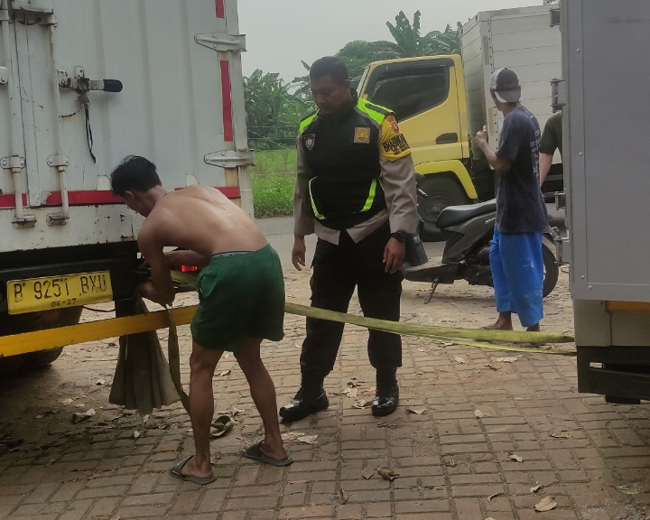 Bhabinkamtibmas Mustikasari Bantu Truk Terjebak di Jalan Mandordemong Mustika Jaya