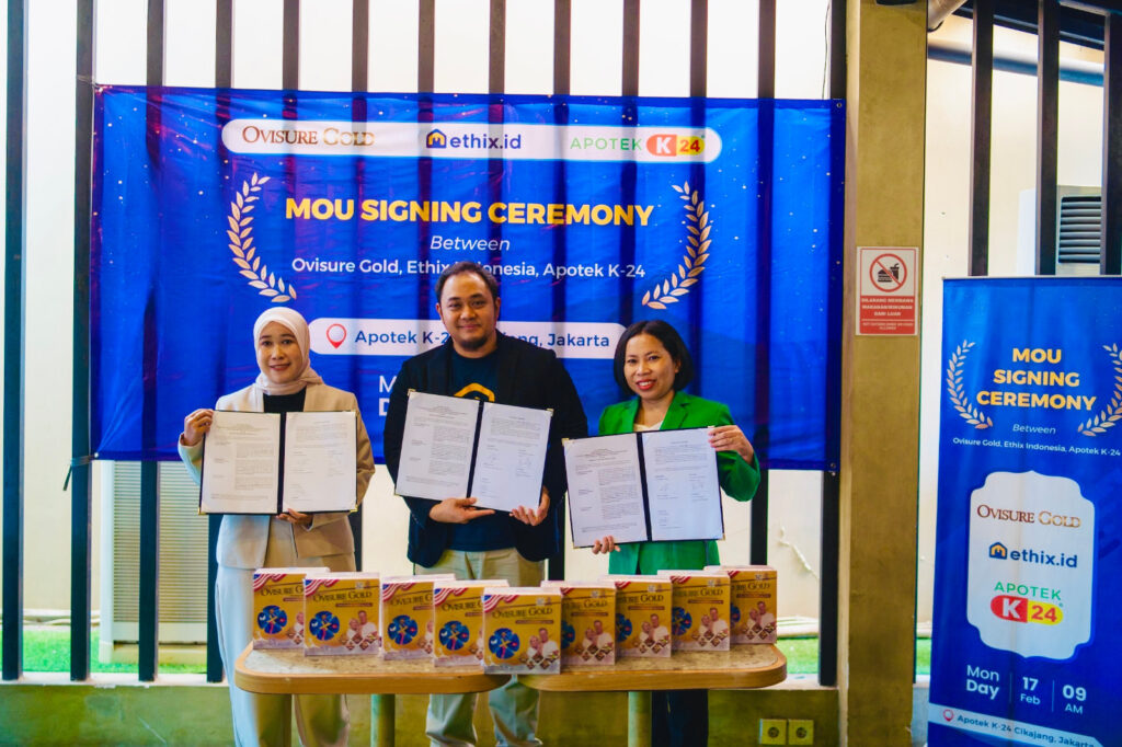 Jakarta – MCN.com – PT Ethix Niaga Teknologi (Ethix Indonesia), PT Bintang Emas Perdagangan Indonesia (Ovisure Gold), dan Apotek K-24 resmi menjalin kerja sama strategis yang ditandai dengan penandatanganan Nota Kesepahaman (MoU) di Apotek K-24 Cikajang, Jakarta Selatan, Senin (17 Februari 2025).