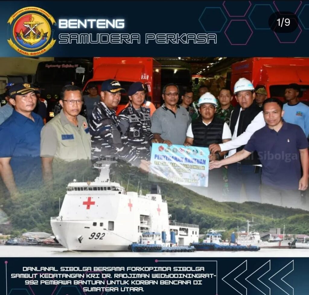 Sibolga – MCN.com – Komandan Pangkalan Angkatan Laut (Danlanal) Sibolga Letkol Laut (P) Haka Andinantha, M.Tr. Opsla., bersama unsur Forum Koordinasi Pimpinan Daerah (Forkopimda) Sibolga, menyambut kedatangan KRI dr. Radjiman Wedyodiningrat-992 di Dermaga Utama Pelindo Sibolga, Kelurahan Sibolga Sambas, Kota Sibolga. Kapal Bantu Rumah Sakit milik TNI Angkatan Laut tersebut membawa berbagai bentuk bantuan kemanusiaan bagi korban bencana alam yang melanda wilayah Sumatera Utara khususnya Kota Sibolga dan Kabupaten Tapanuli Tengah, Kamis (04/12/2025).