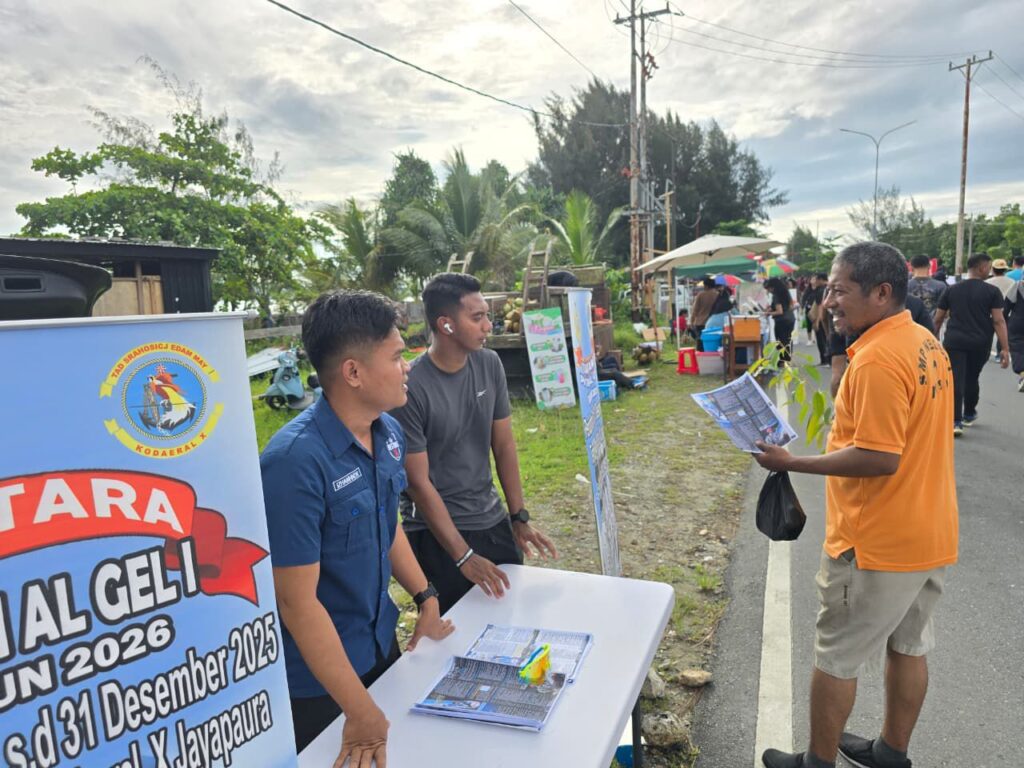 Jayapura – MCN.com – Komando Daerah Angkatan Laut (Kodaeral) X melaksanakan kegiatan sosialisasi dan pembagian brosur penerimaan calon Bintara Pria/Wanita serta calon Tamtama TNI Angkatan Laut Gelombang I Tahun Anggaran 2026 dalam rangkaian kegiatan Car Free Day (CFD) di Jalan Holtekam, Jayapura. Kegiatan ini dilaksanakan secara berkelanjutan pada tanggal 29 November 2025, 6 Desember 2025, dan 13 Desember 2025, sebagai upaya menjangkau generasi muda secara langsung di ruang publik yang strategis dan diminati masyarakat.
